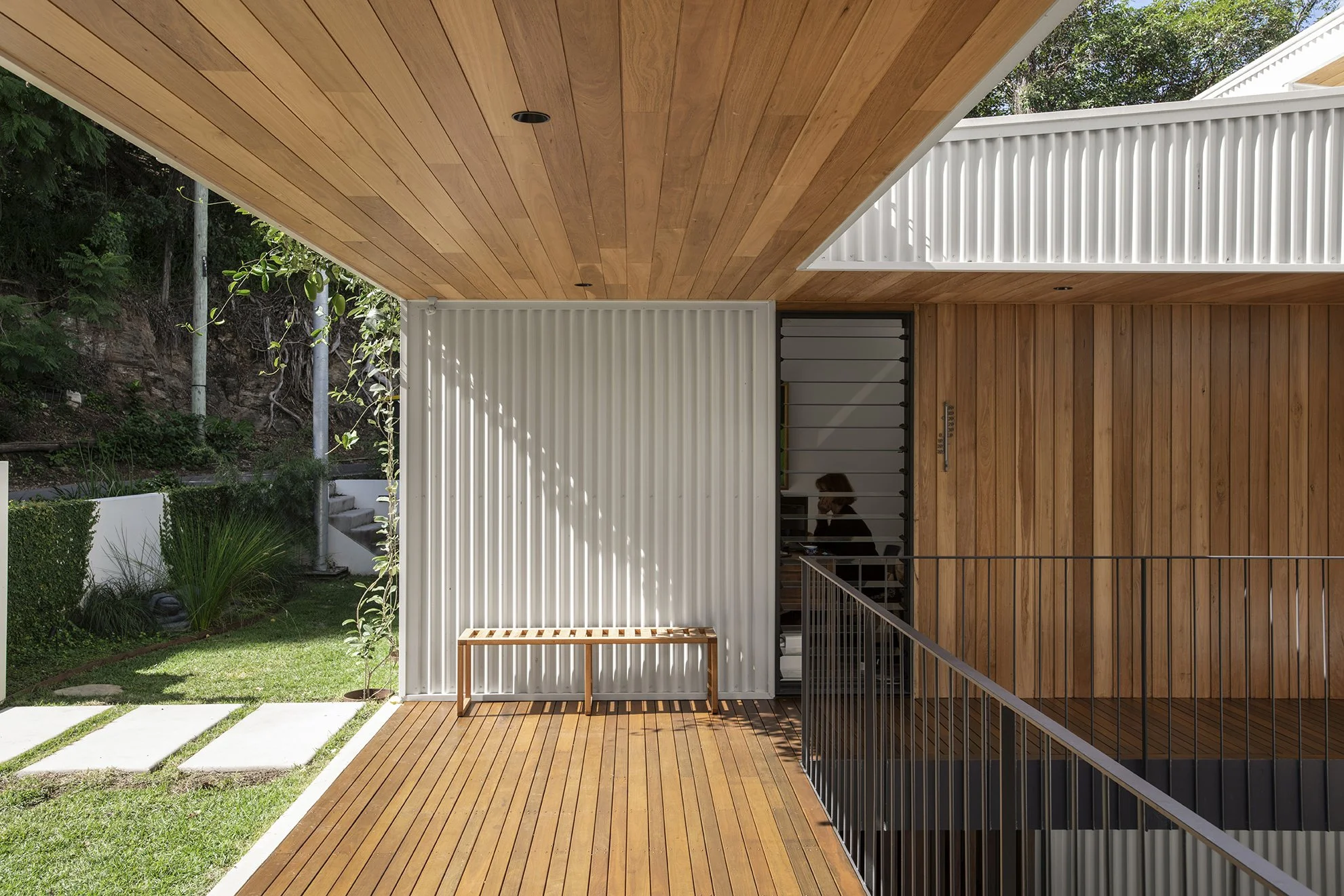 A two storey house, located on a steep sloping site on the banks of the Brisbane River. The house presents a modest appearance from the street. With north to the front of the site and views to the south, a central courtyard acts as a light well and increases the opportunities for natural ventilation.